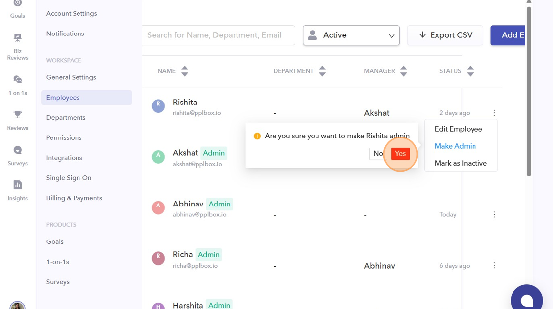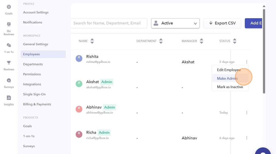 - Search for the employee whom you want to make an Admin, then click the three dots next to their name and choose "Make Admin".
