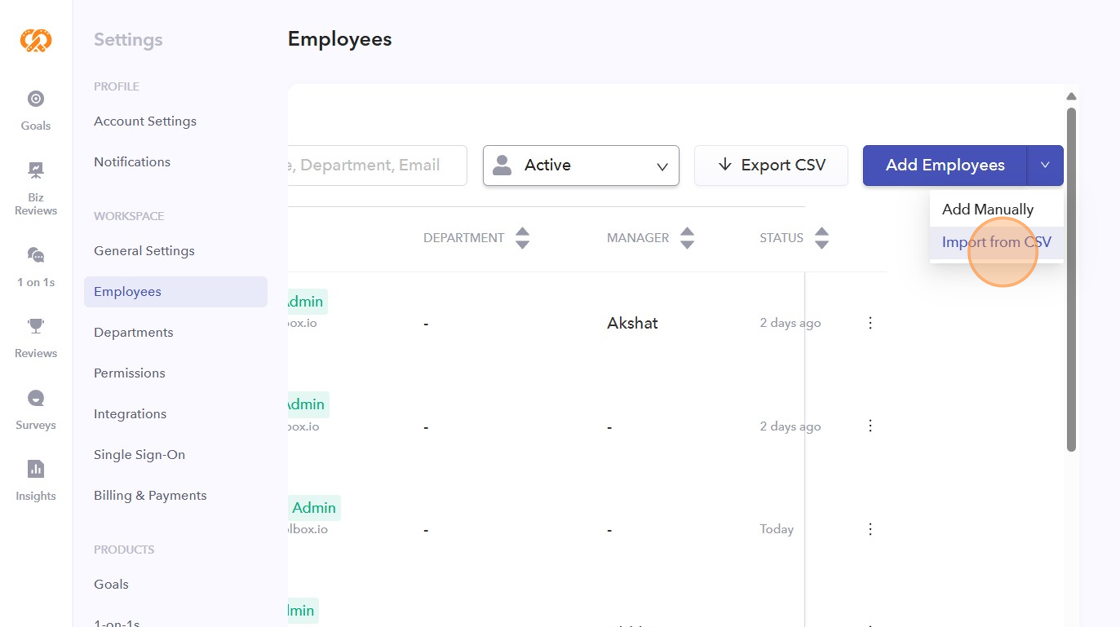 - Add multiple employees at once by selecting the "Import from CSV" option.