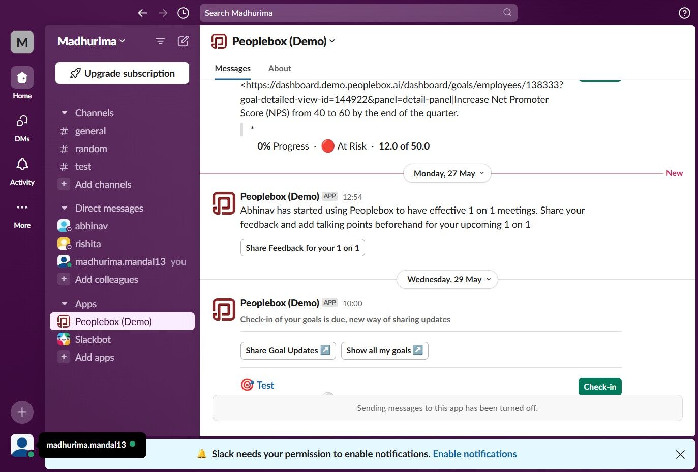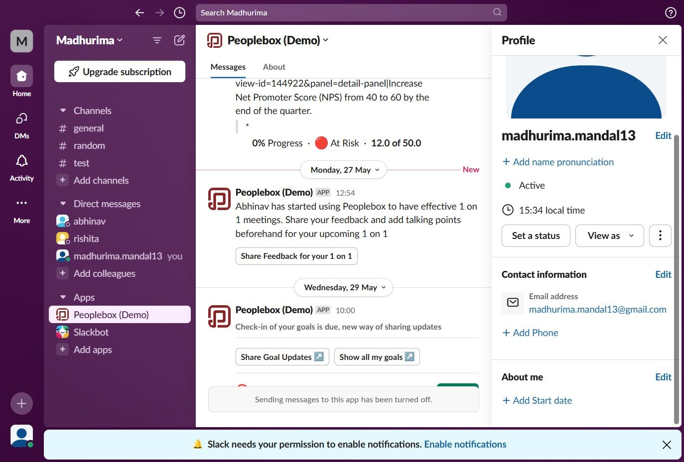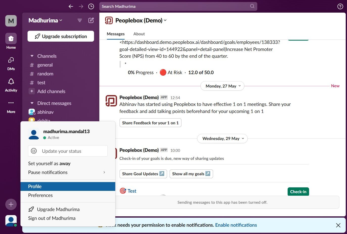 If you didn't get a notification for your performance review in Slack, mostly it would be because your email address in Slack and email address in our system is different. Here is how you can find your slack email address: