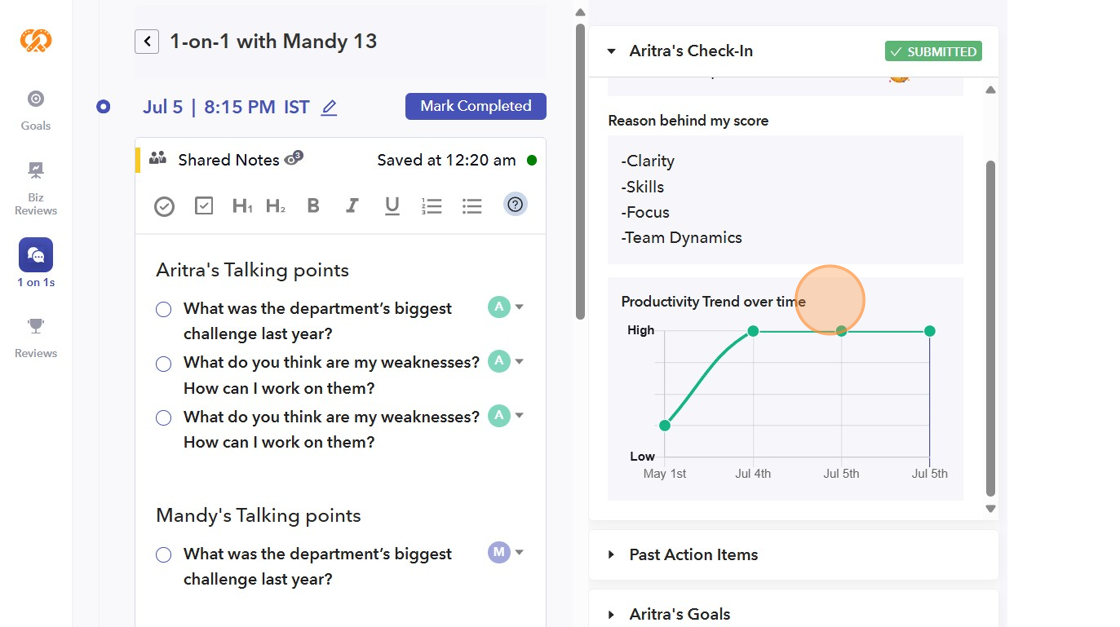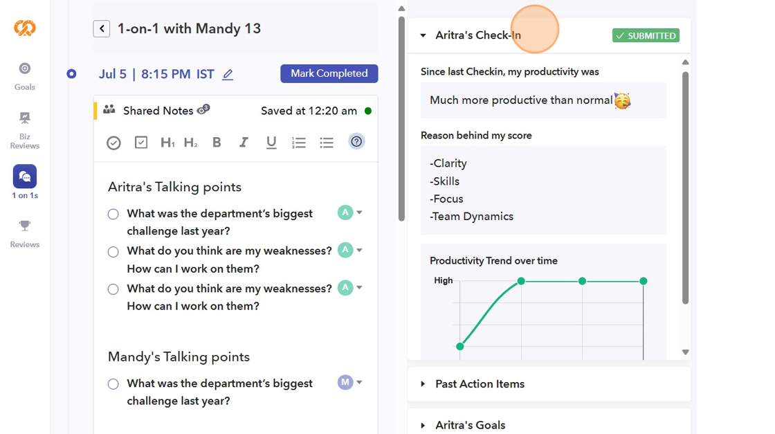 - First, open any 1-on-1 meeting with your manager. On the right, you will see your productivity. Similarly, in every 1-on-1 meeting, you can see your productivity response as well.