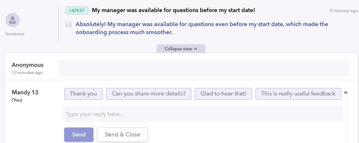 The open text messages are always anonymous. When you reply to any message, the employee gets a notification with your name and the reply you sent.