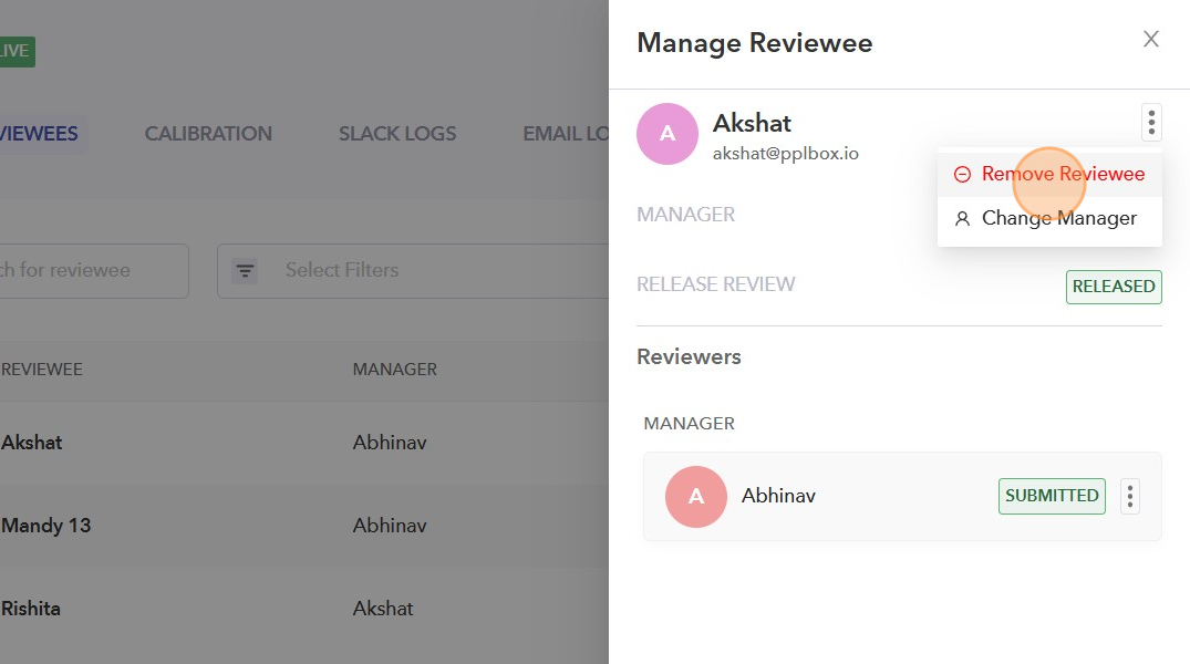 - Select the three vertical dots in the upper right corner and click "Remove Reviewee".