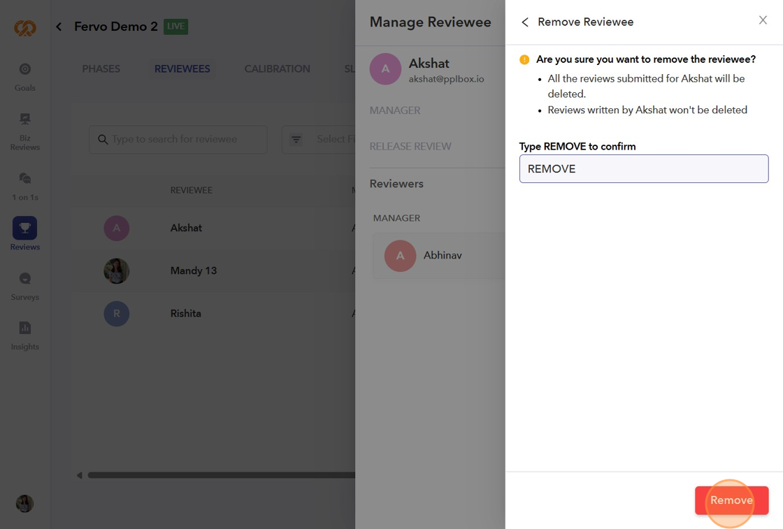 - Type "REMOVE" and click on the Remove button below, the Reviewee will be removed from the Review Cycle.