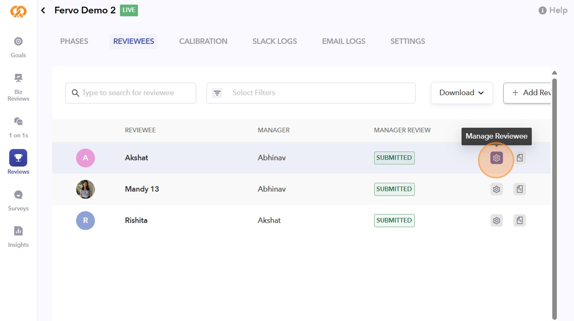 - On the Reviewees tab choose the Reviewee you want to remove and click on "Manage Reviewee".