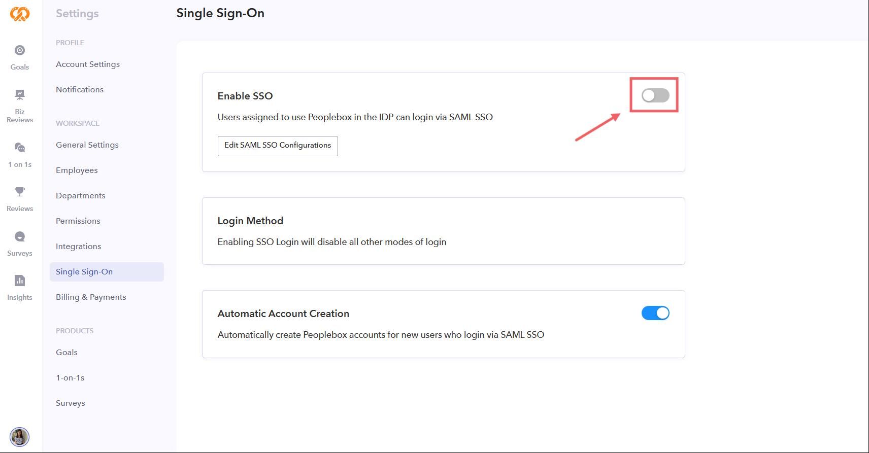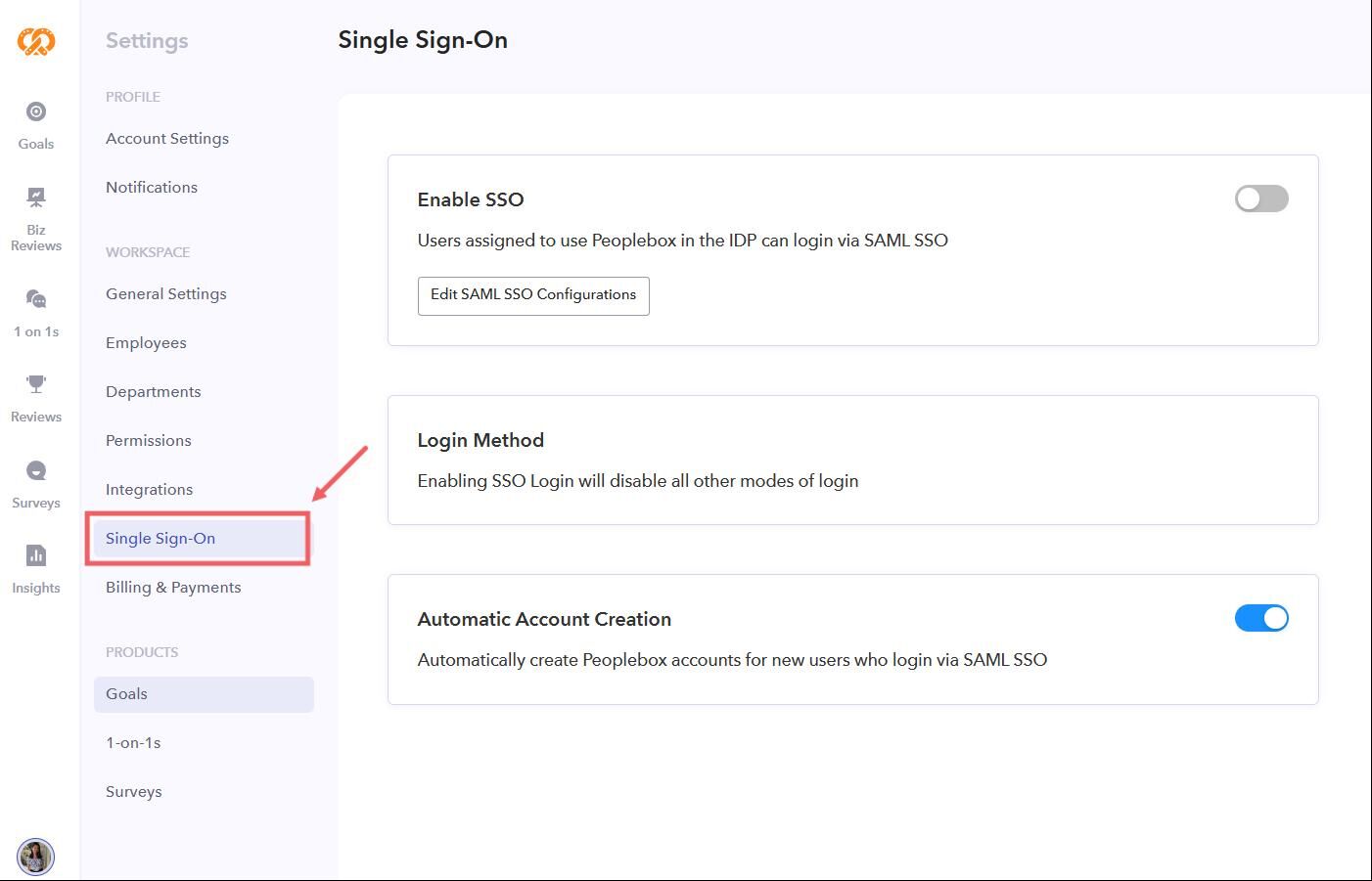 Access your Peoplebox "Settings" and click on the "Single Sign-On" option.