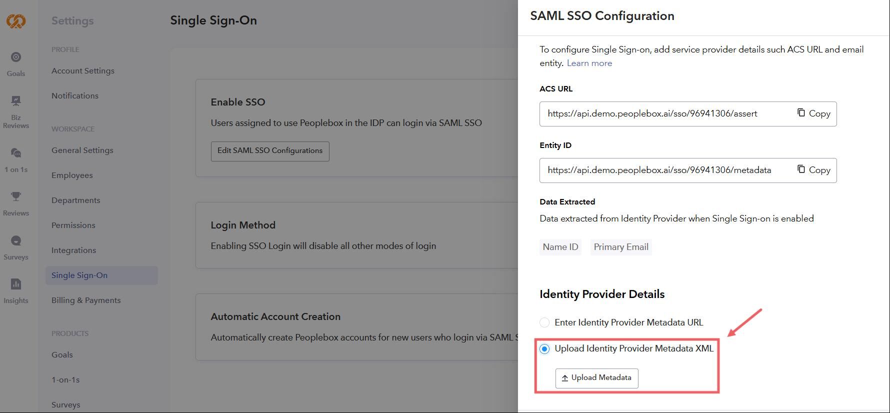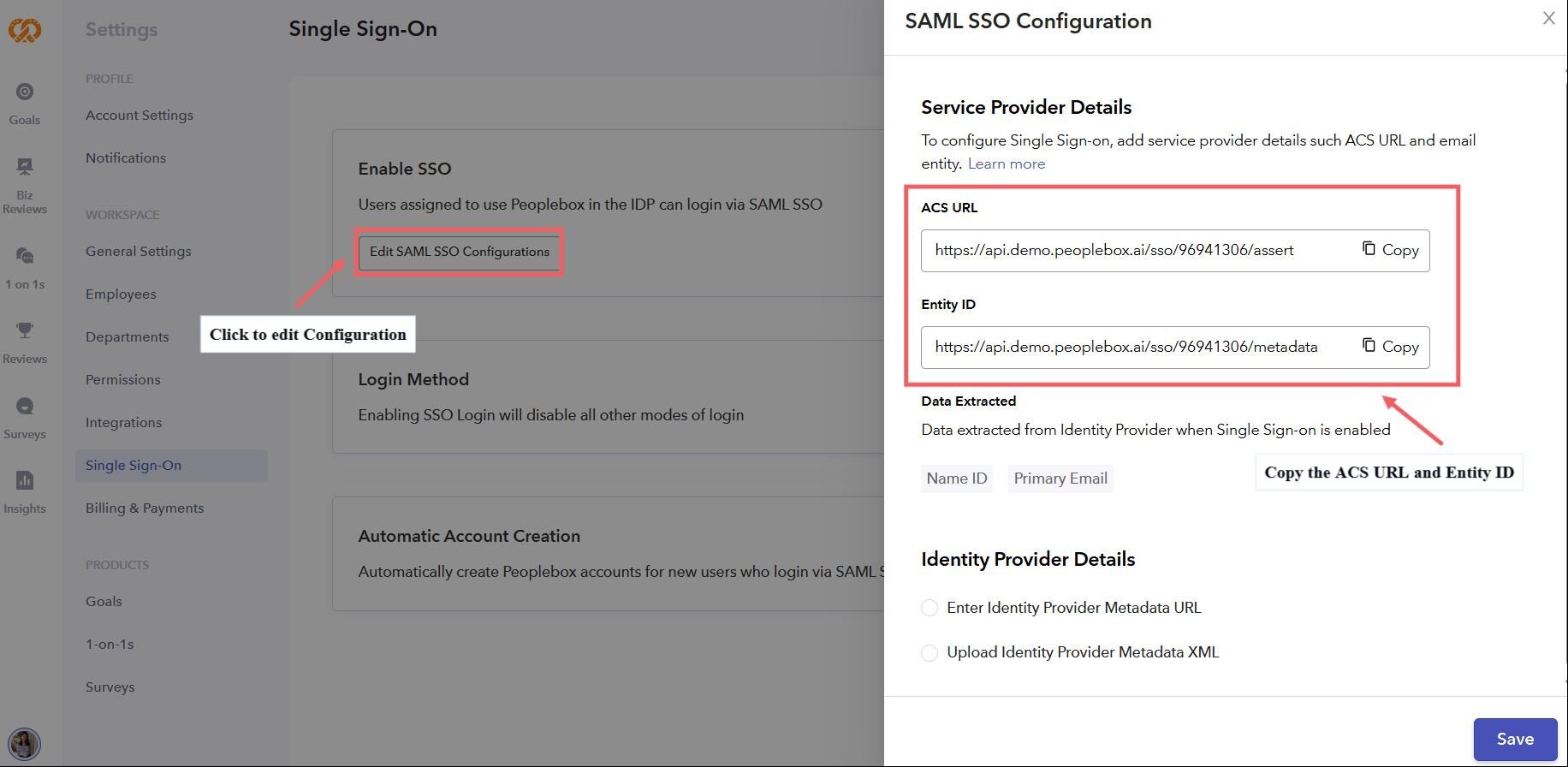 Configure SSO: In this step, copy the SSO ACS URL and add it to your Identity Provider app (e.g., Okta, OneLogin, etc.) to generate the metadata XML file.