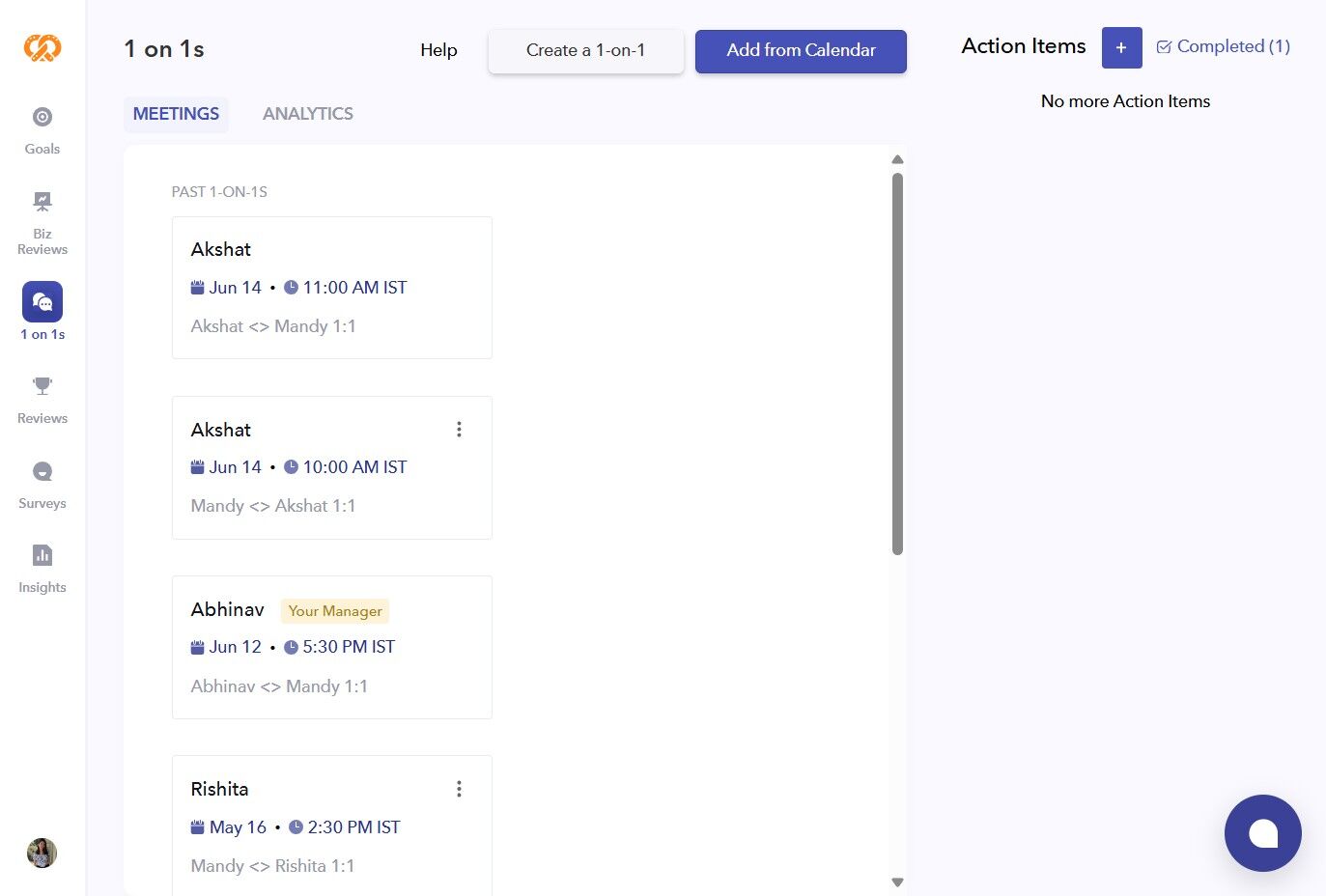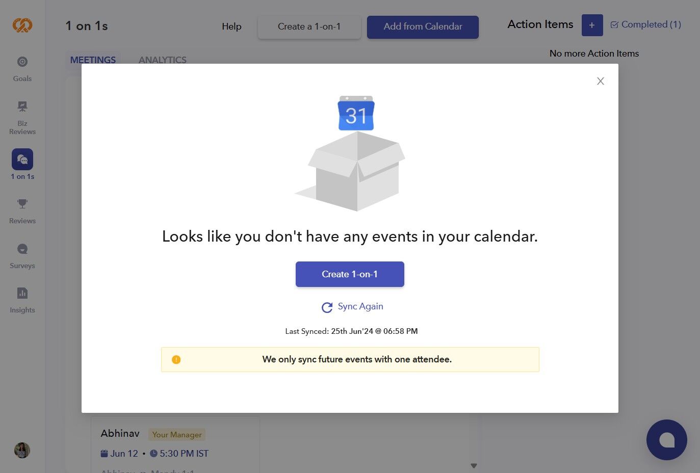 - After syncing your calendar, all the 1-on-1s will automatically appear on the tool. However, if no 1-on-1s are scheduled, you can create one from here.