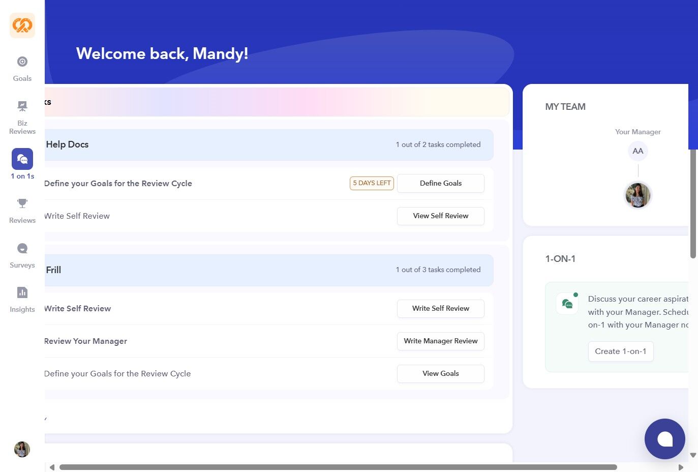 - On the left sidebar of your dashboard, click on the "1 on 1s" icon.