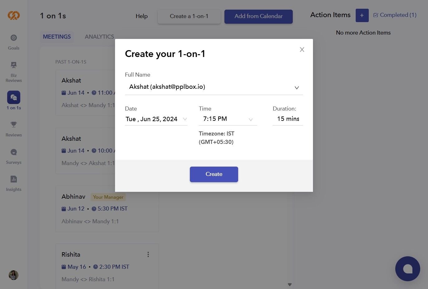 - Select the employee, date, time, and duration of the 1-on-1, then click "Create". Your 1-on-1 with the employee will be scheduled.
