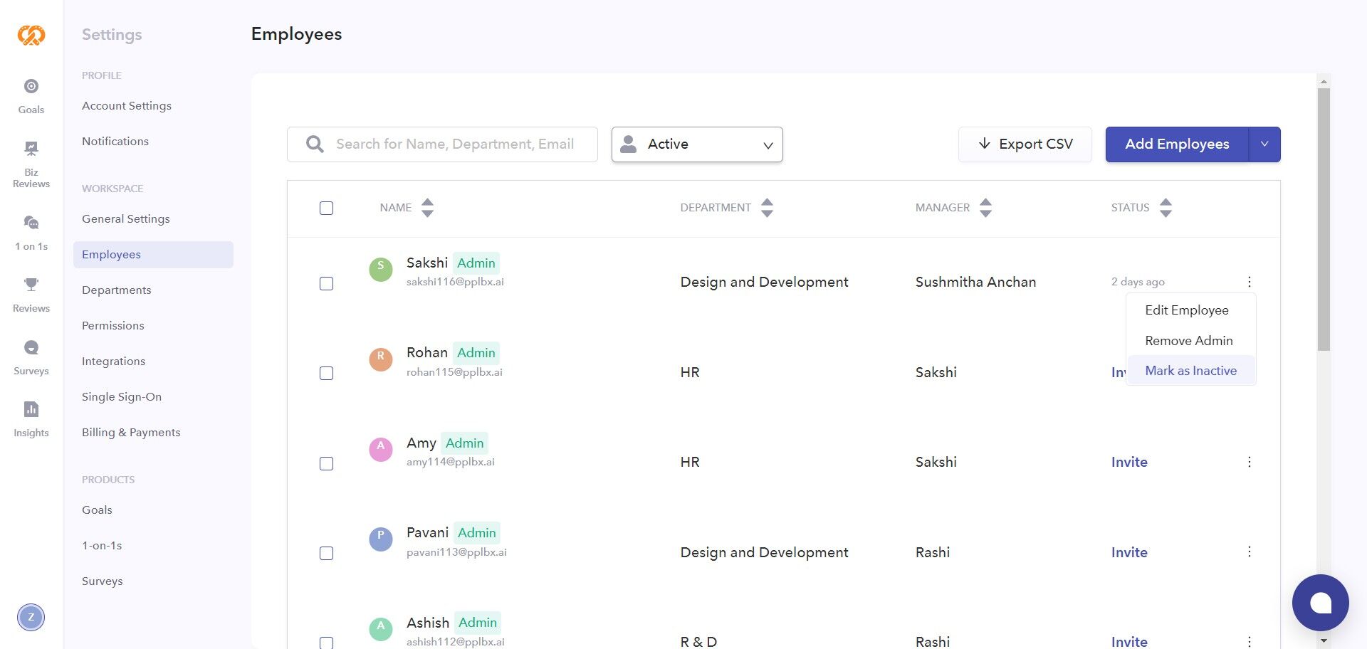 If you no longer wish to include an employee in Peoplebox, you can mark them as inactive. By doing this, the employee will no longer be part of Peoplebox, will not be able to access any of your account's data and also not be counted in your billing.
