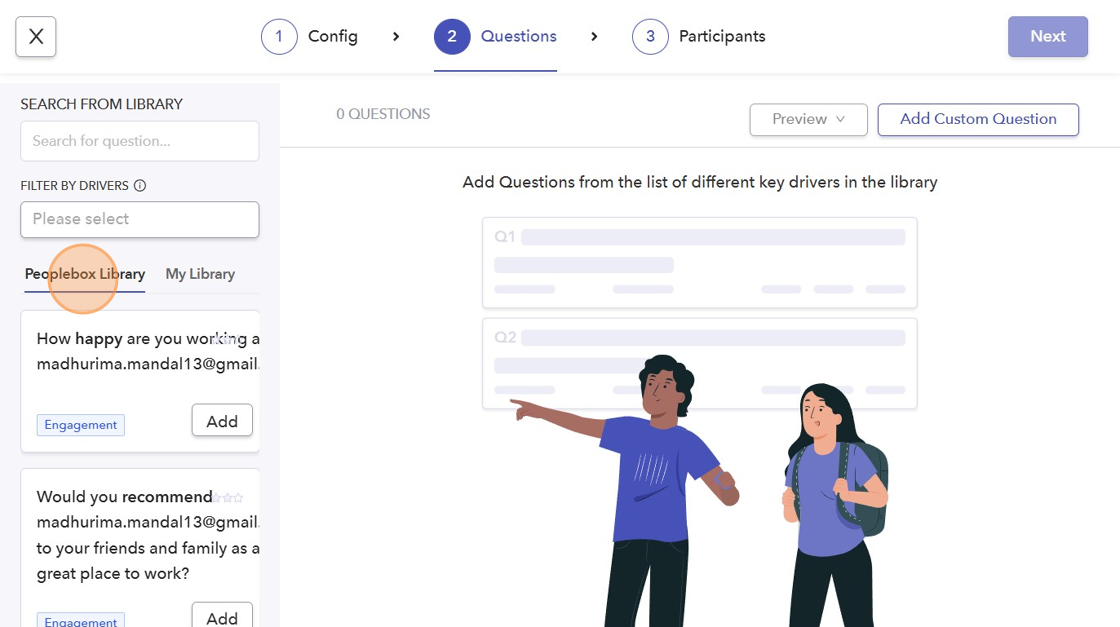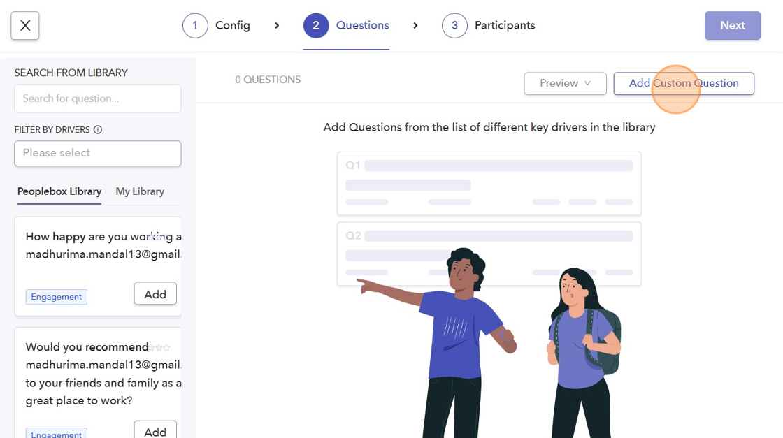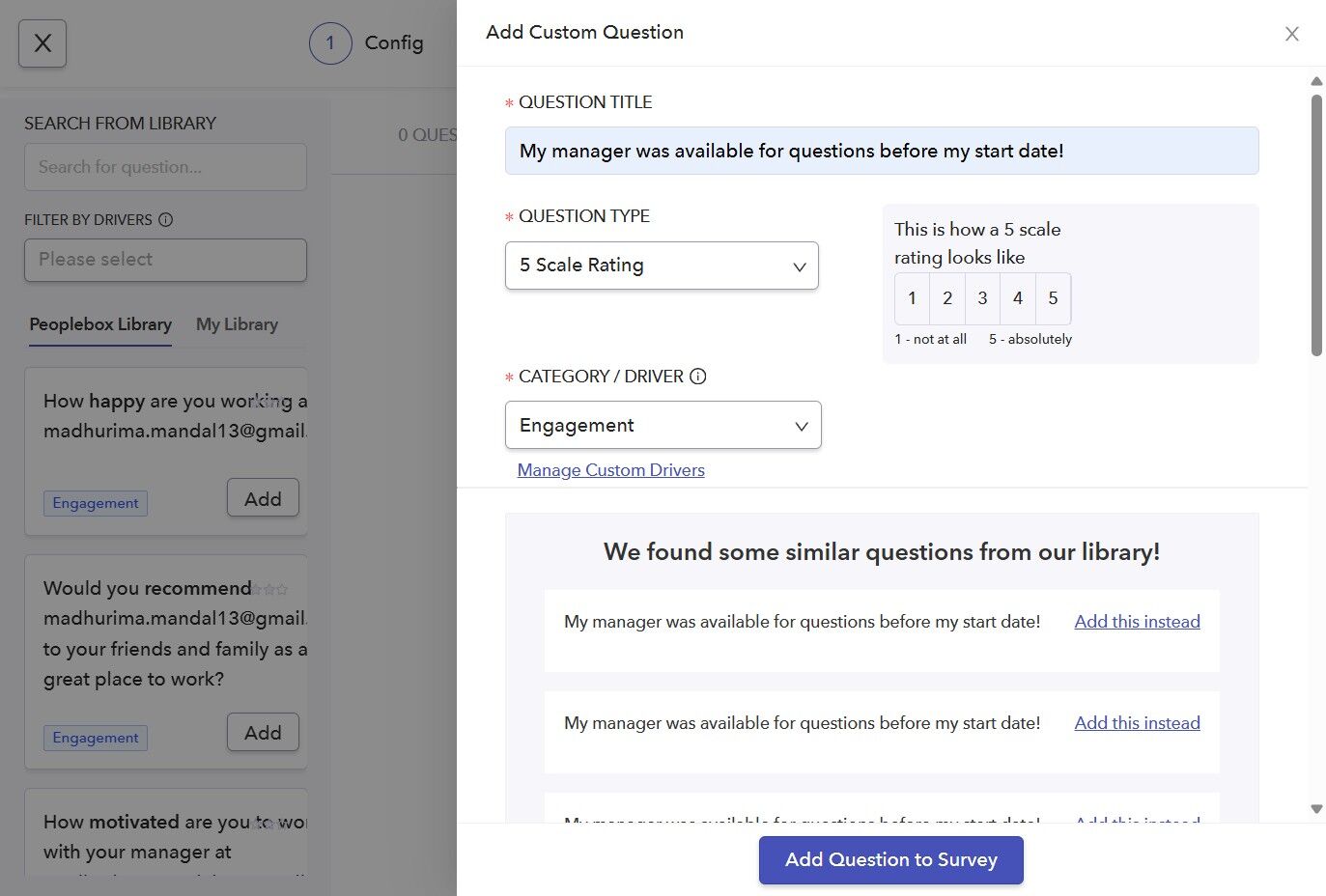 - Type your question in the given space. Select the type of question (5 scale rating or open text) and the driver/category. Then, click on "Add Question to Survey".