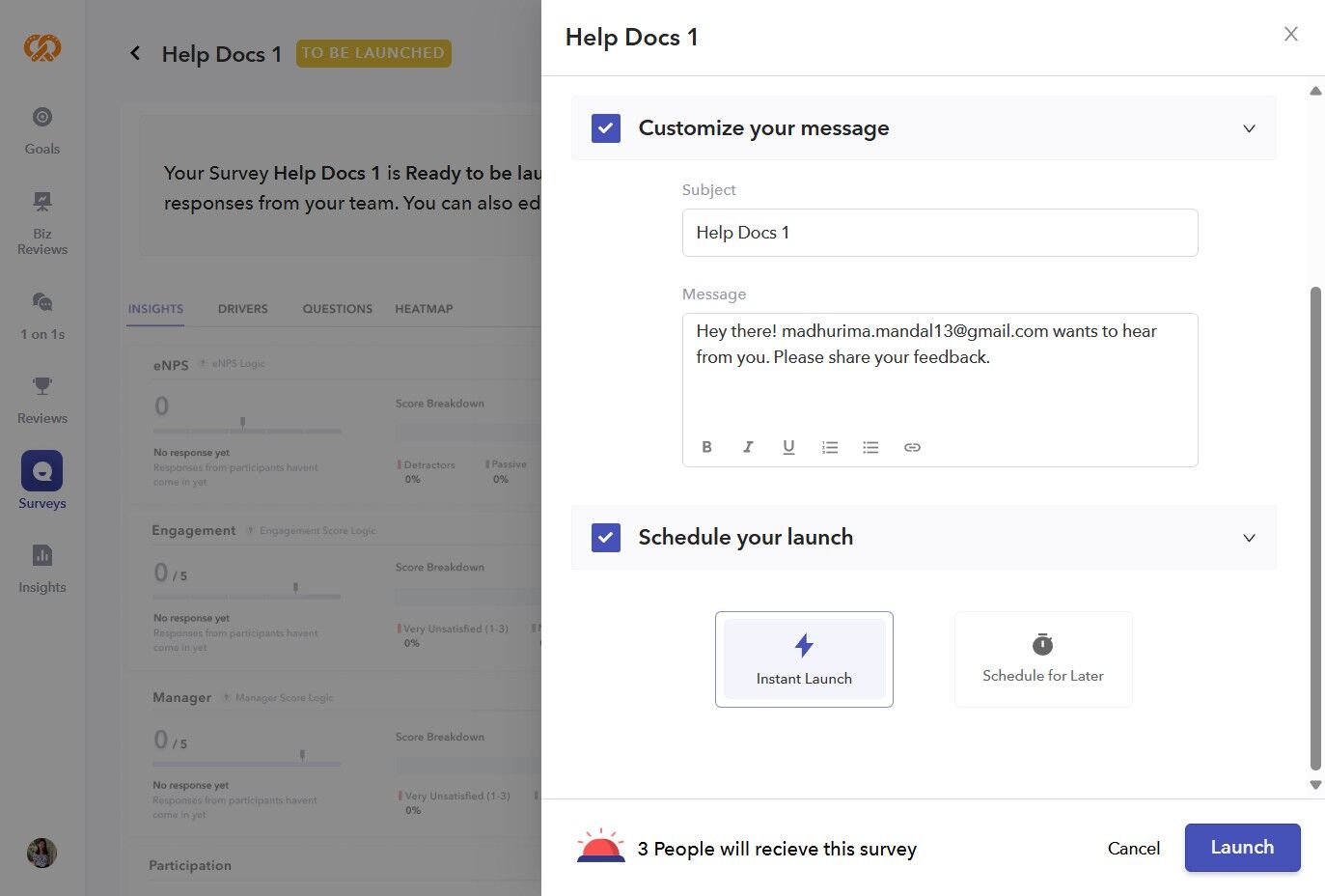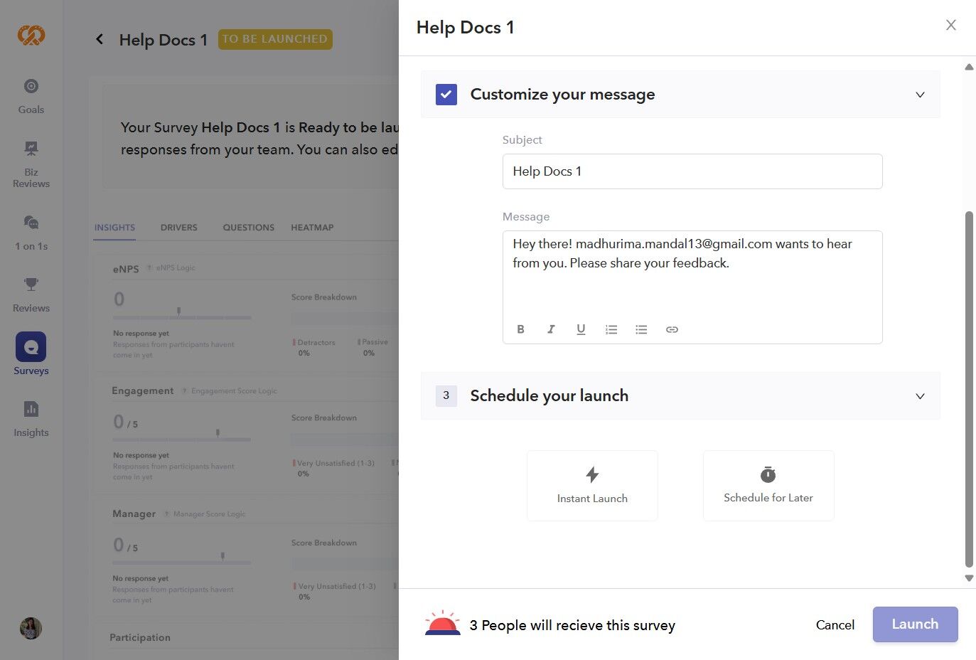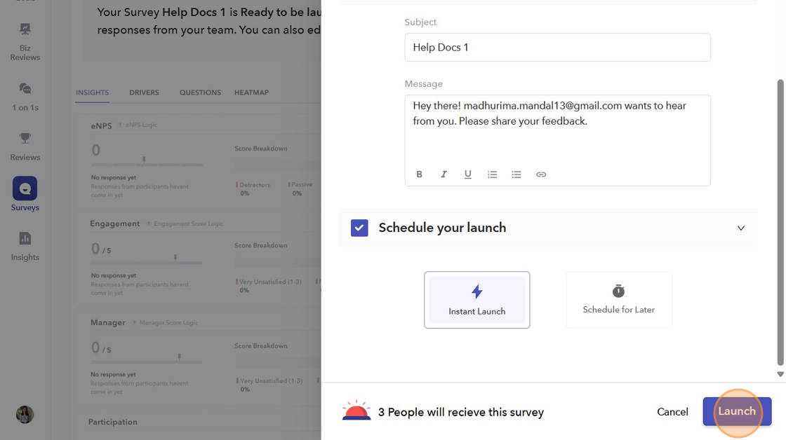 - You can launch the survey instantly or schedule it for a specific time and date.