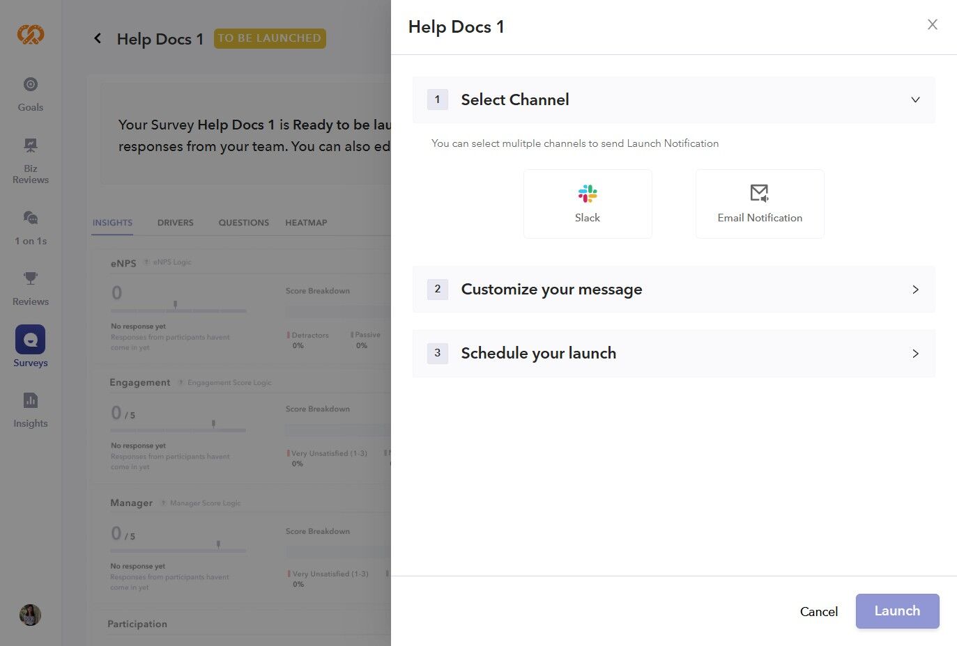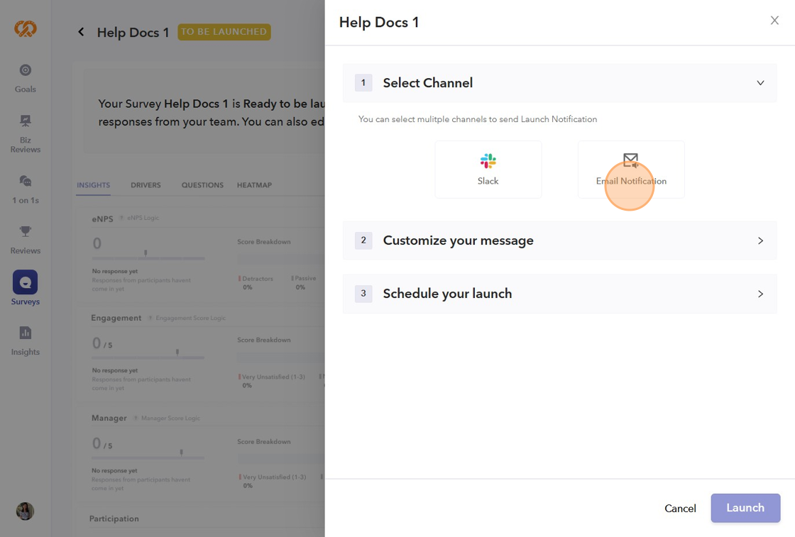 - Select a channel for launching the survey: "Slack" or "Email Notification". You have the option to customize your message as well.