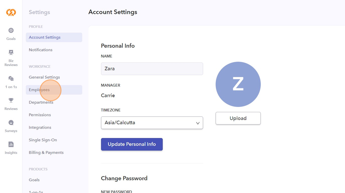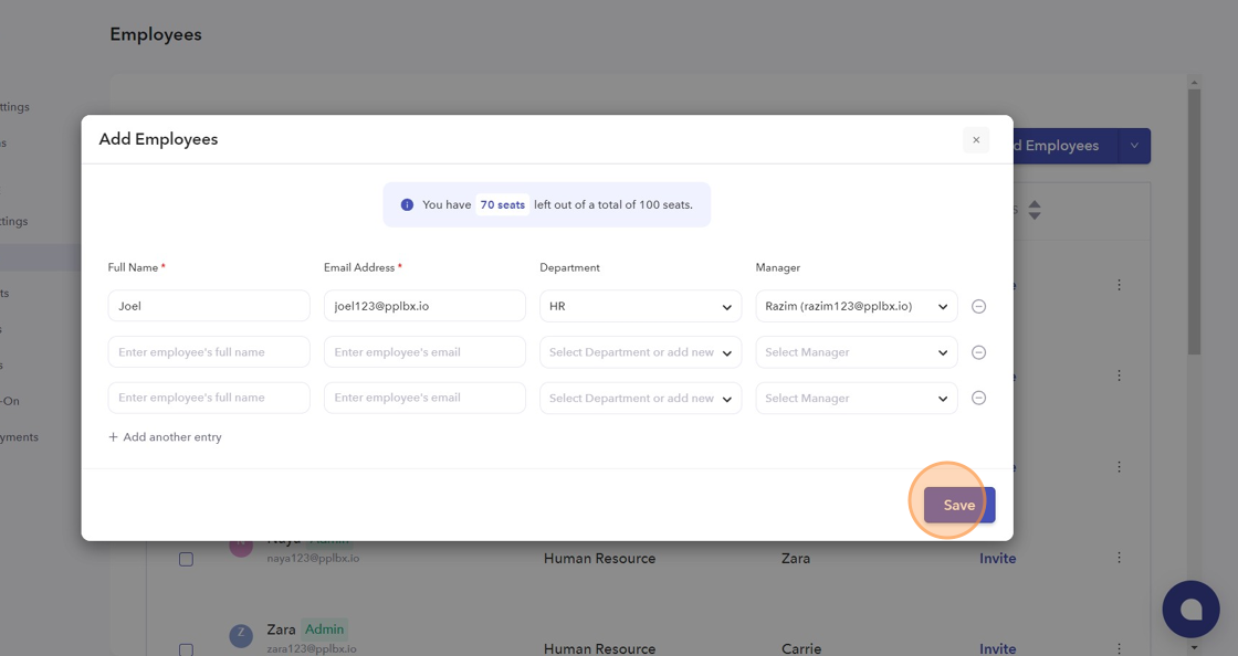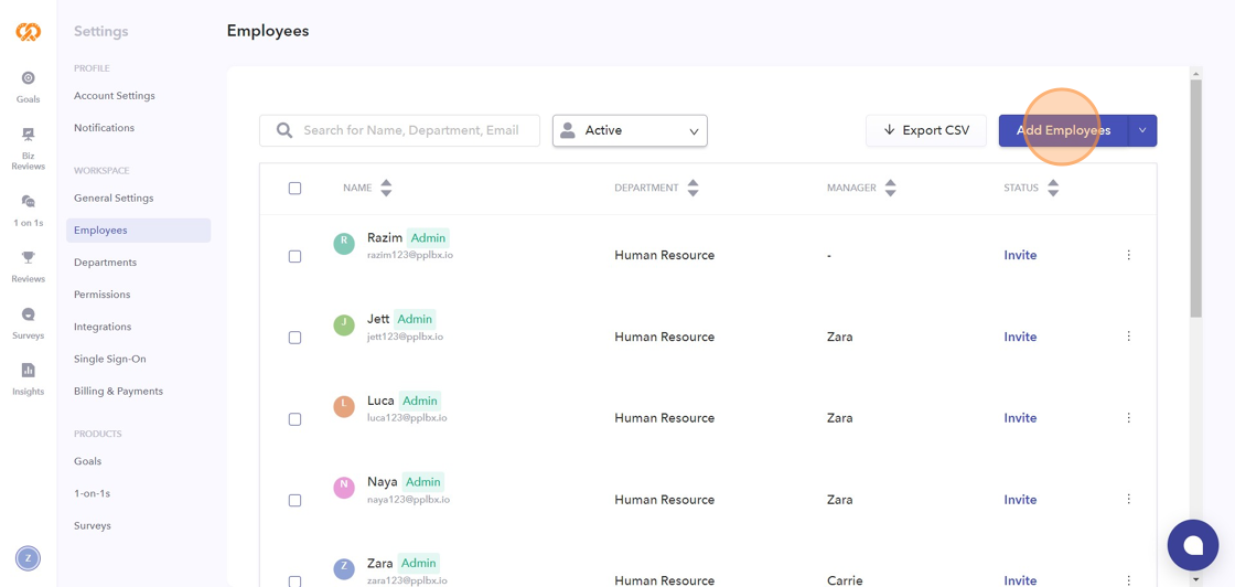 Go to the "Settings" option present in your profile name on the bottom left corner. Click on "Employees" and then you will see a list of all the employees who have been added to Peoplebox. This is how you add new employees to Peoplebox: