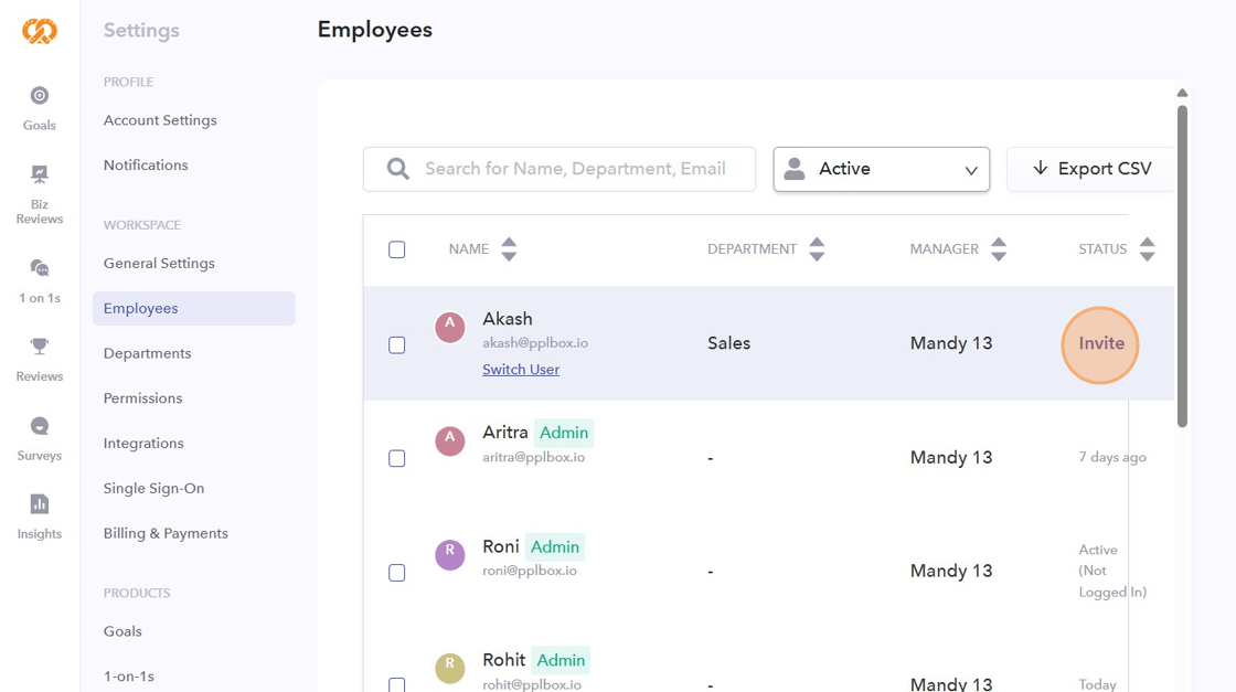 - Under the status column click "Invite" to directly send them an invite to join Peoplebox.