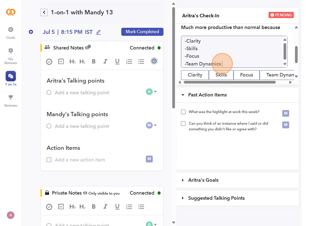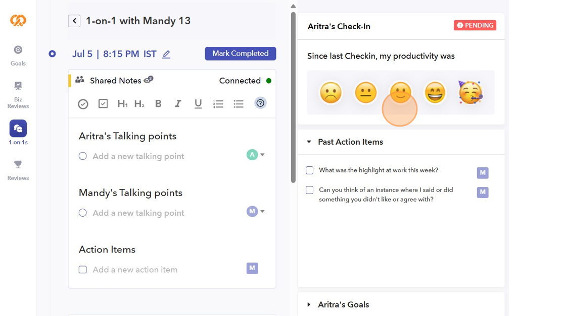 Your productivity rating will be visible to your manager. This will help you and your manager to evaluate your productivity from time to time. You can check-in your productivity before or after your 1-on-1 meeting.