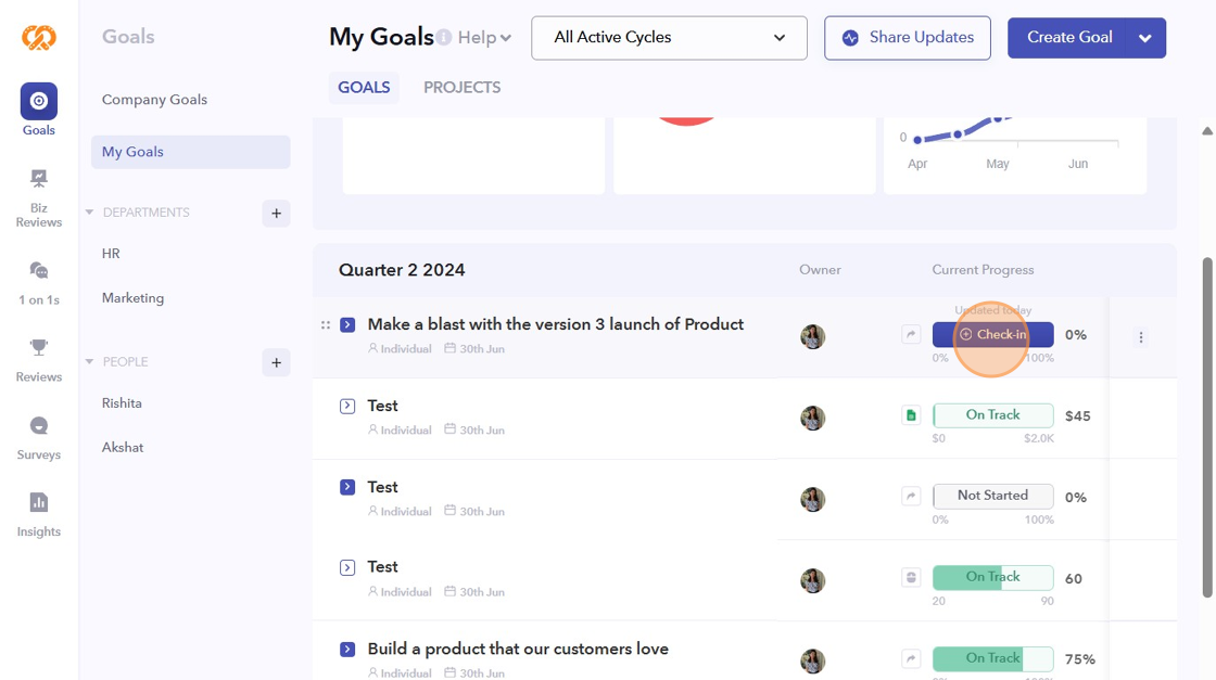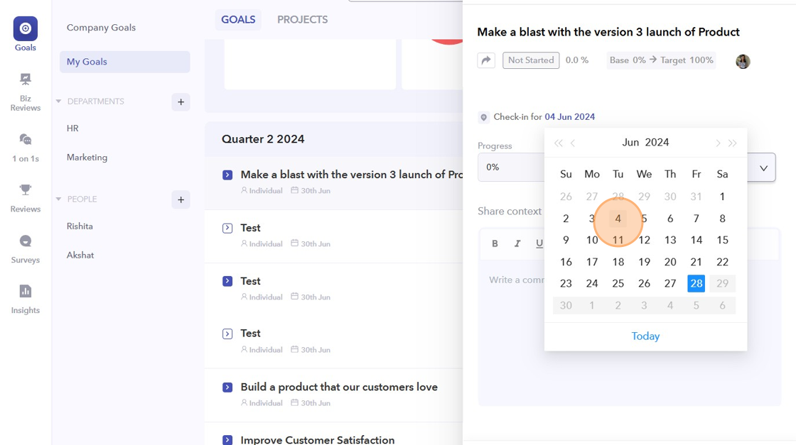 - While creating a new check-in, in the check-in modal, along with progress, status, and context, you will have the "Check-in for Today" option.