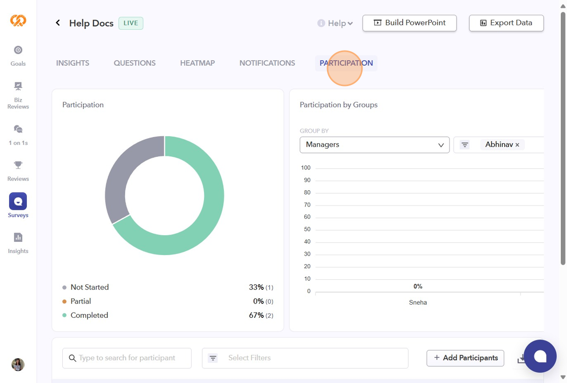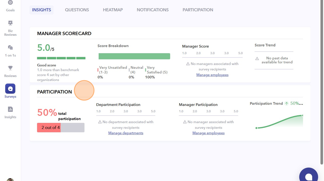 - Under "Insights," select "Participation" to view survey participation percentages by department and manager.