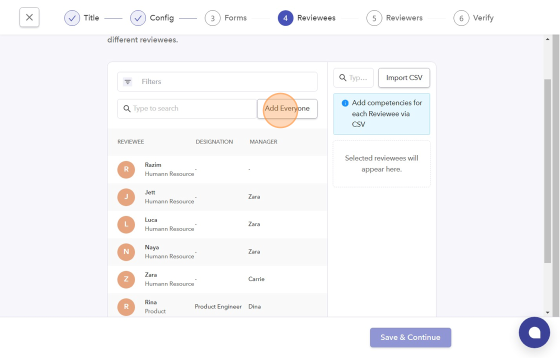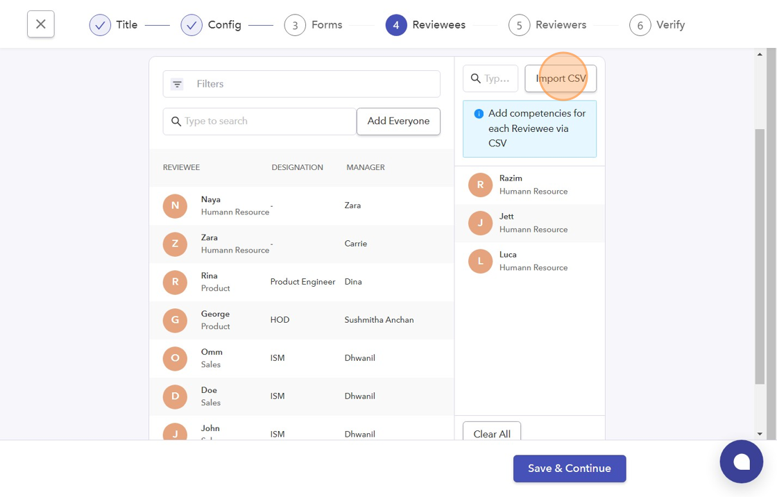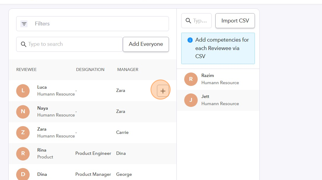 - To upload the Reviewees list with competencies and custom attributes, choose "Import CSV".
