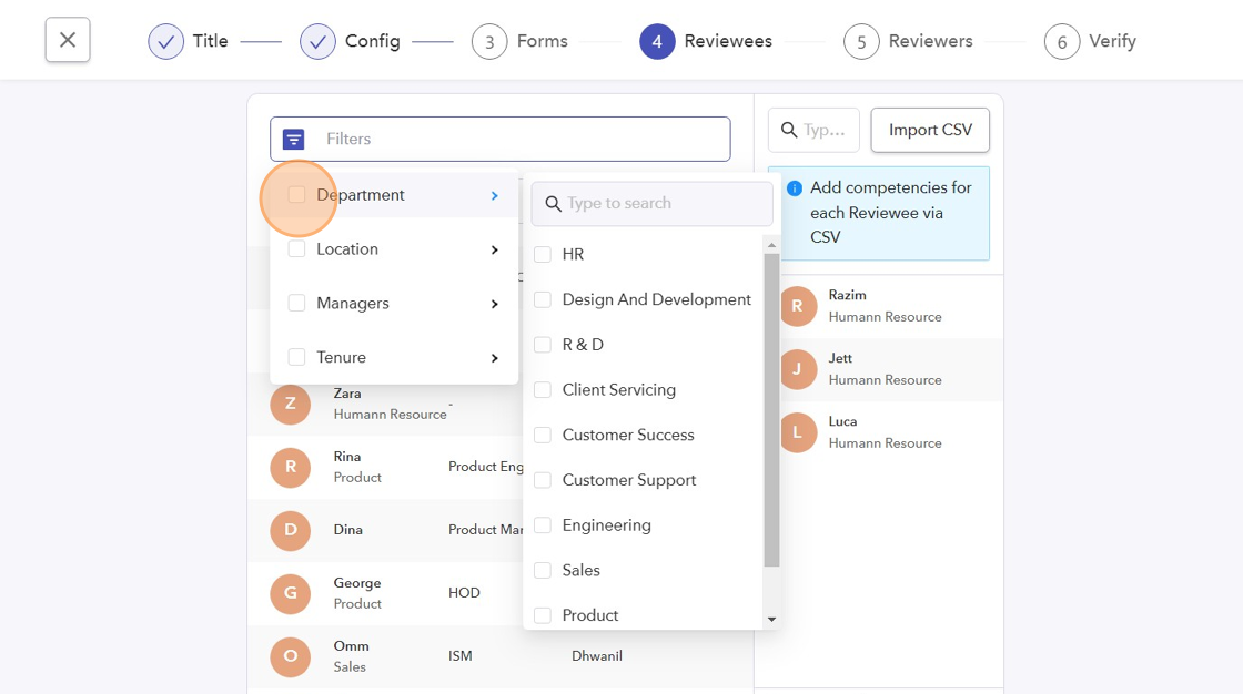 - You can use the Filters panel to sort reviewees by Department, Location, Managers, and Tenure.